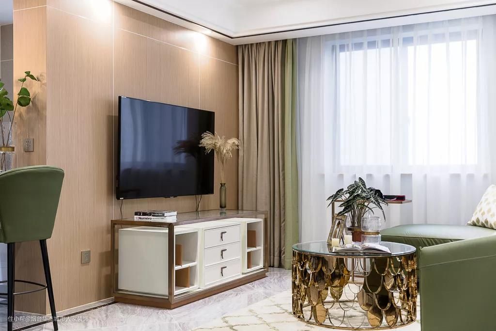 电视墙以木饰面的背景,搭配白色电视柜与壁挂电视机,整体简洁自然,给人以轻松愉悦的视觉体验。