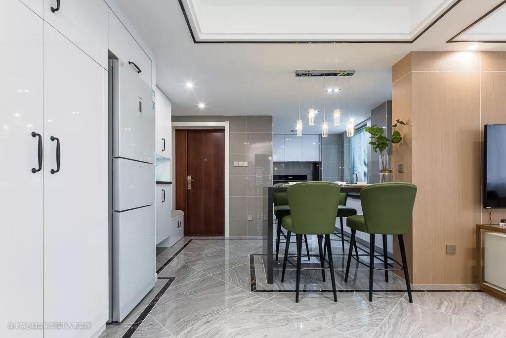 餐厅以定制大理石吧台式餐桌,搭配绿色的高脚餐椅,让用餐氛围显得端庄而又有仪式感。