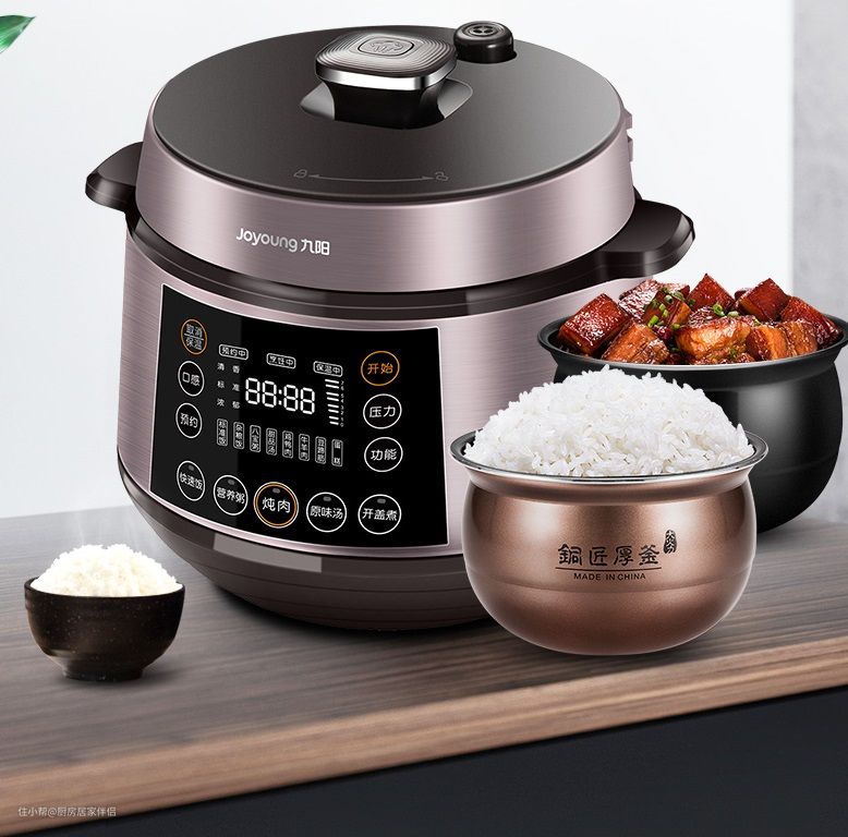 品牌是国内口碑品牌九阳,内胆材质是铝合金内胆+冷轧钢晶瓷胆,这类内胆能让国内受热均匀,加热方式是环流加热,热量可以回流,保证食材受热均匀,保证口感。容量:6L这款容量很大,8口人的饭随便煮。