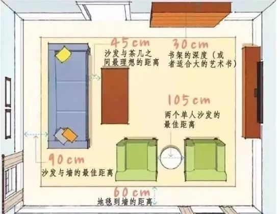 沙发与茶几之间的距离在450mm最合适,这样的距离在能保证一个人能通过的同时又便于二者的使用,即人不但能通过,且坐在沙发上时可以比较舒服的拿到茶几上的东西。一般茶几的最佳高度为300mm—450mm。