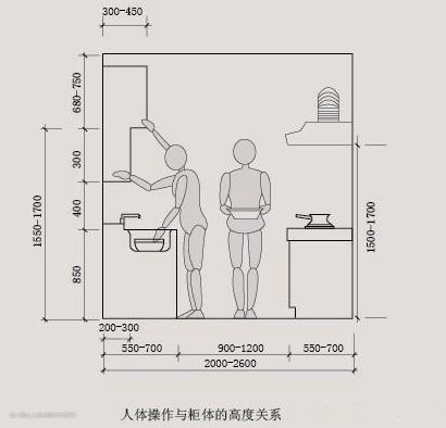 身高和厨房台面的高度关系可以按公式推送:身高/2+(5~10)公分。这样的高度正好是人的手臂自然抬起的高度。