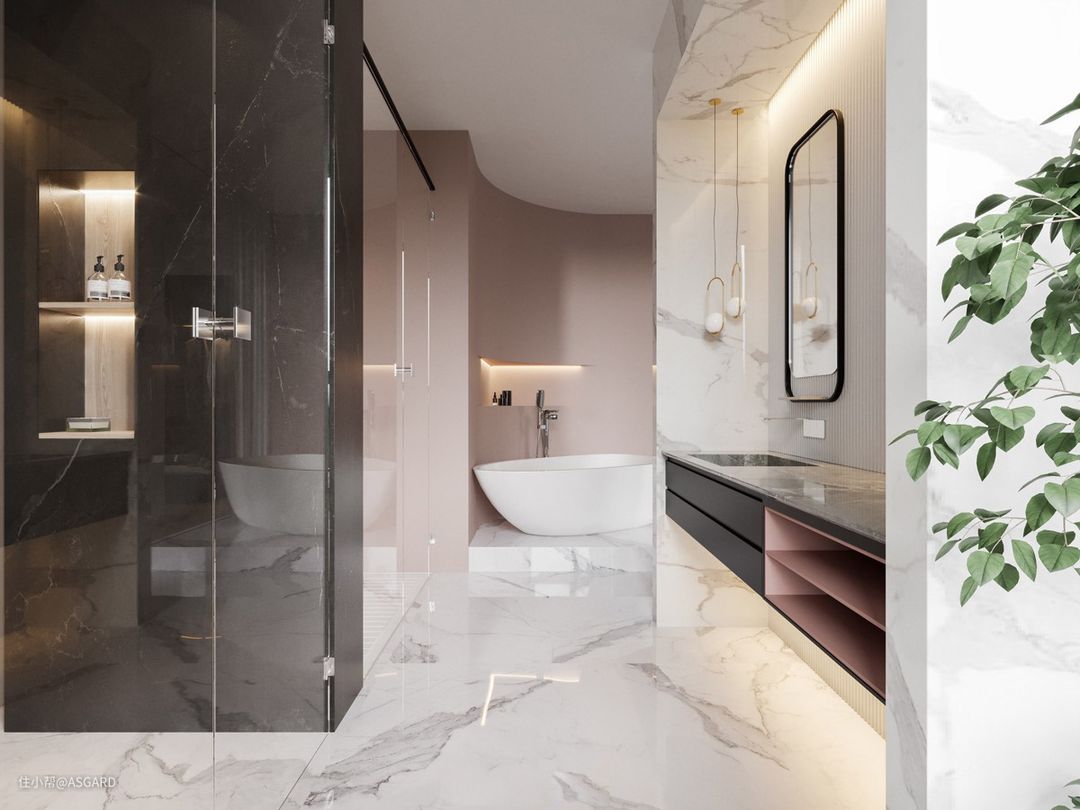 保持松散。这种柔和的腮红浴室设计探索了家具和固定装置的松散布局。带镜子的盥洗台放在一个完全不同的基座水槽旁,旁边有一个镜子,这个镜子没有特别分配。结果是设计不受标准限制。