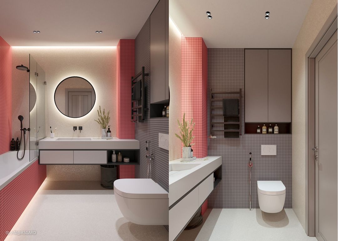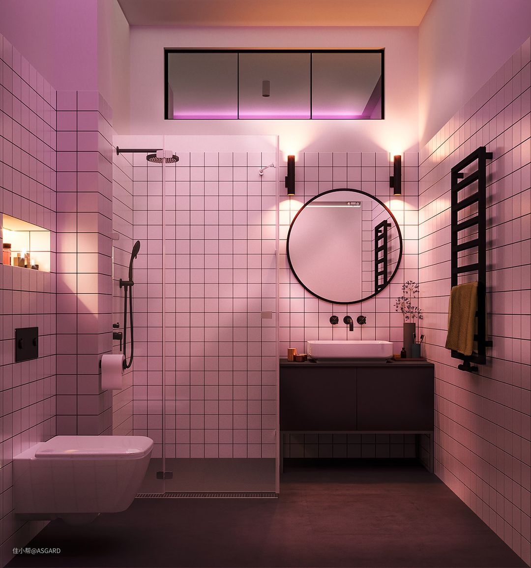 心情的切换点亮了粉红色和白色的浴室主意。这次将粉红色的墙壁推向侧面,以使大气照明将白色的洗手盆墙壁冲洗下来。