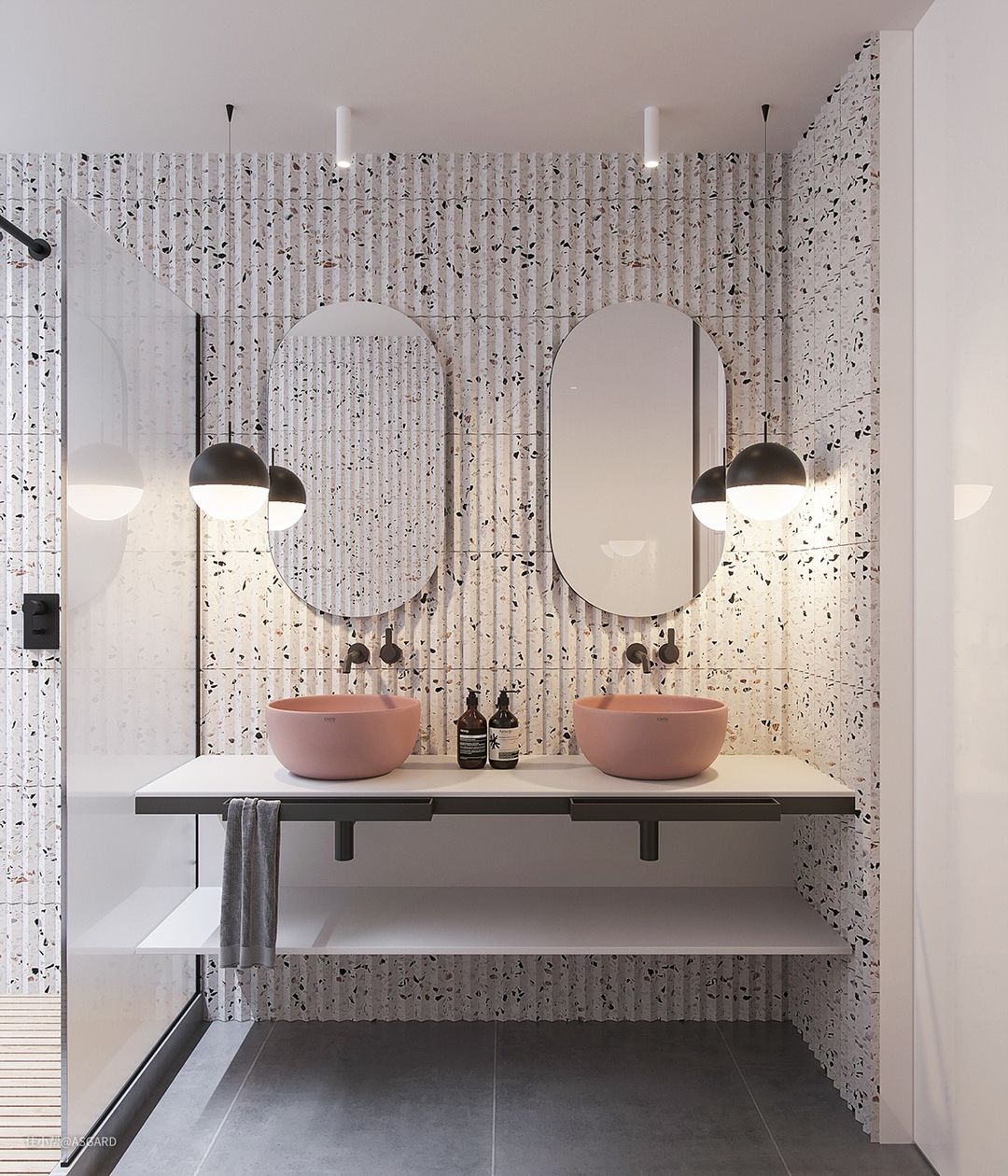 脚尖踩水磨石。铺设水磨石,为粉红色浴室增添时尚气息。五彩纸屑图案现在正处于流行趋势,它为纯粉色方案带来了有趣的优势。