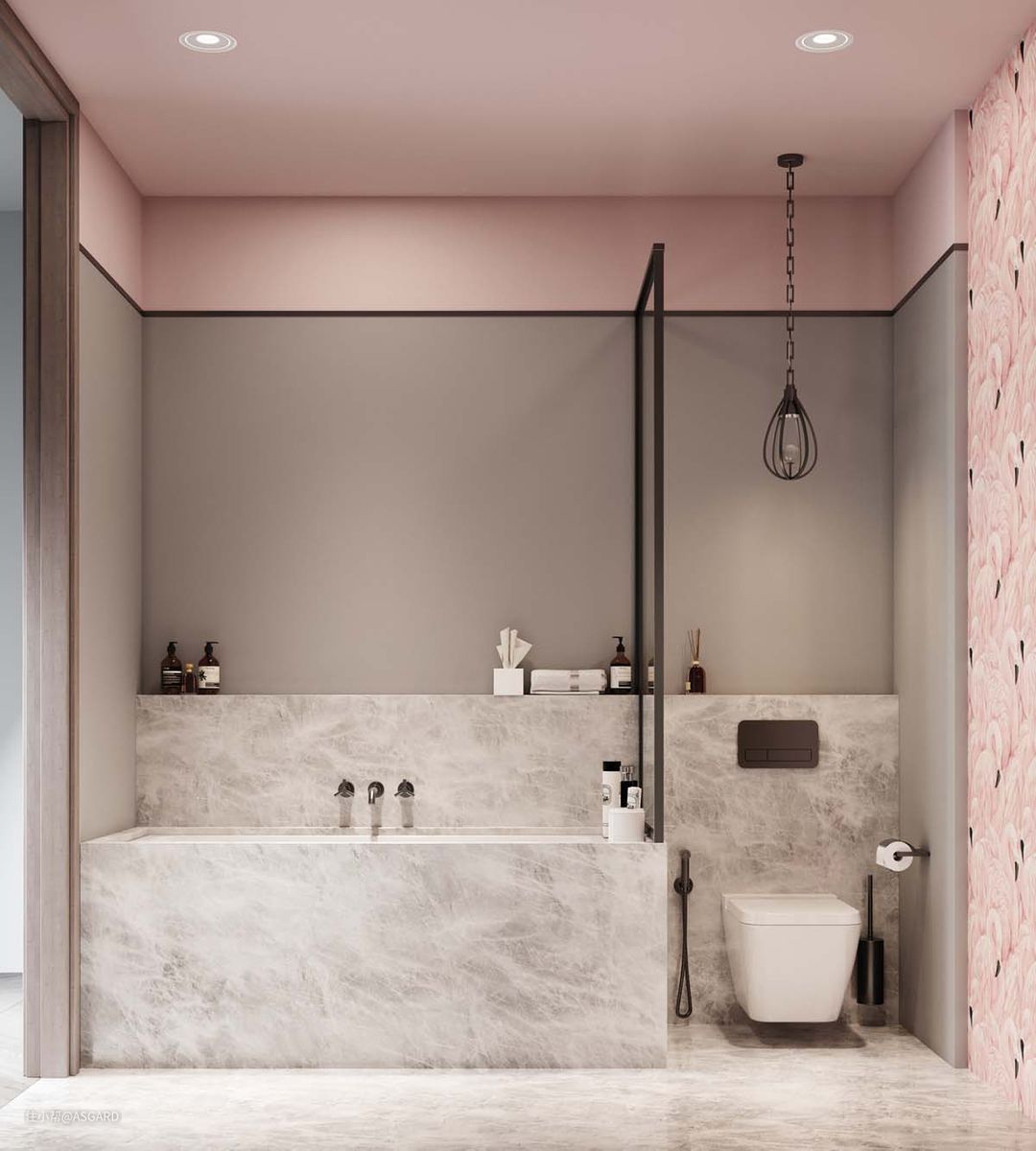 将粉红色的陈述与厚实的黑白大理石相结合,营造出奢华的外观。
