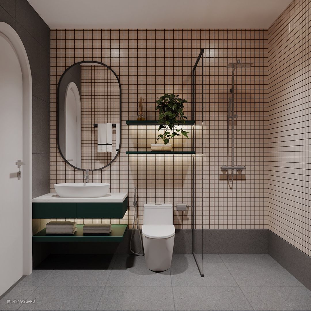 绿色具有相似的对比效果,尽管深绿色的叶子往往会营造出一种平静的感觉,就像在粉红色的日落中漫步穿过公园一样。这种粉红色和绿色的浴室设计将色彩比例分为50/50;浅粉红色的油漆使墙壁的上半部变亮,而绿色瓷砖和浴室家具则占下部的重量。