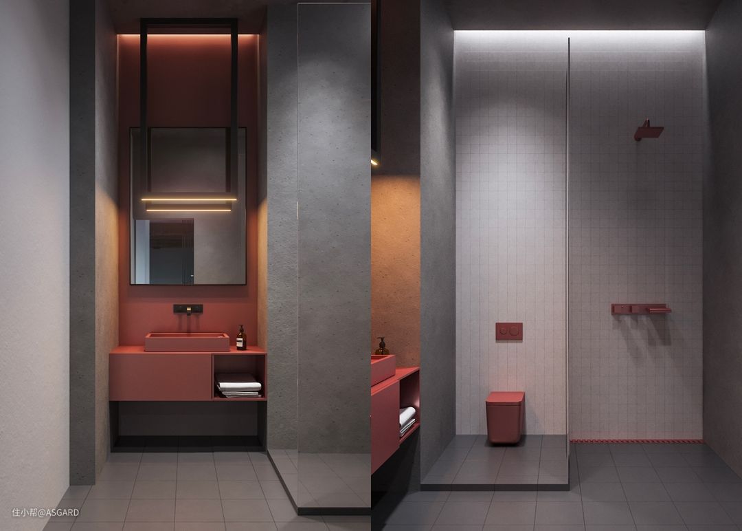 粉红色的英雄作品在自然中性的环境下也具有相似的效果,在此处以粉红色和棕色浴室设计的一部分进行说明。