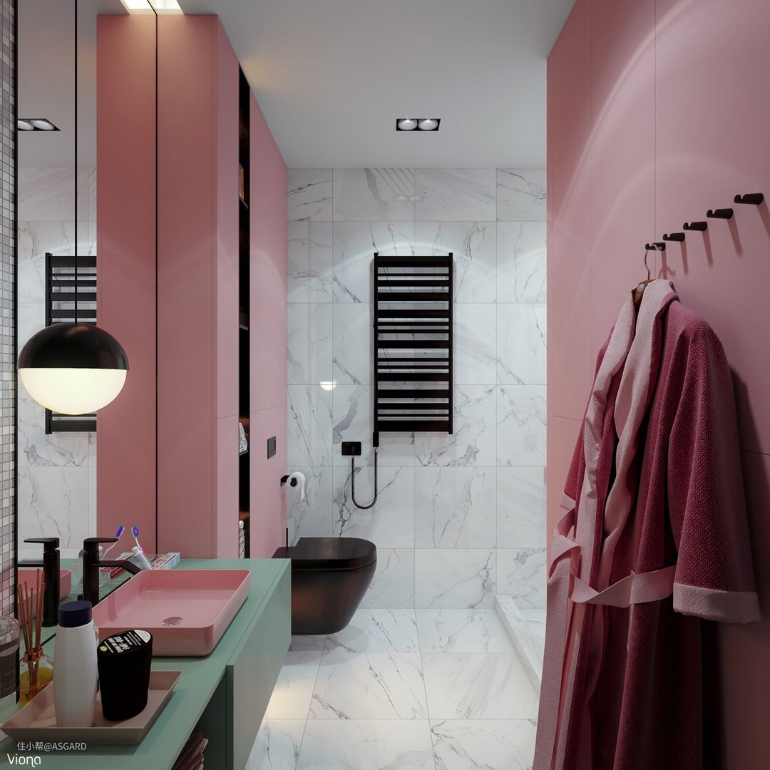 全部上架。这种粉红色和黑色的浴室设计使所有玫瑰色看起来都恰到好处,而下方的所有颜色均为纯黑色,因此融化了。