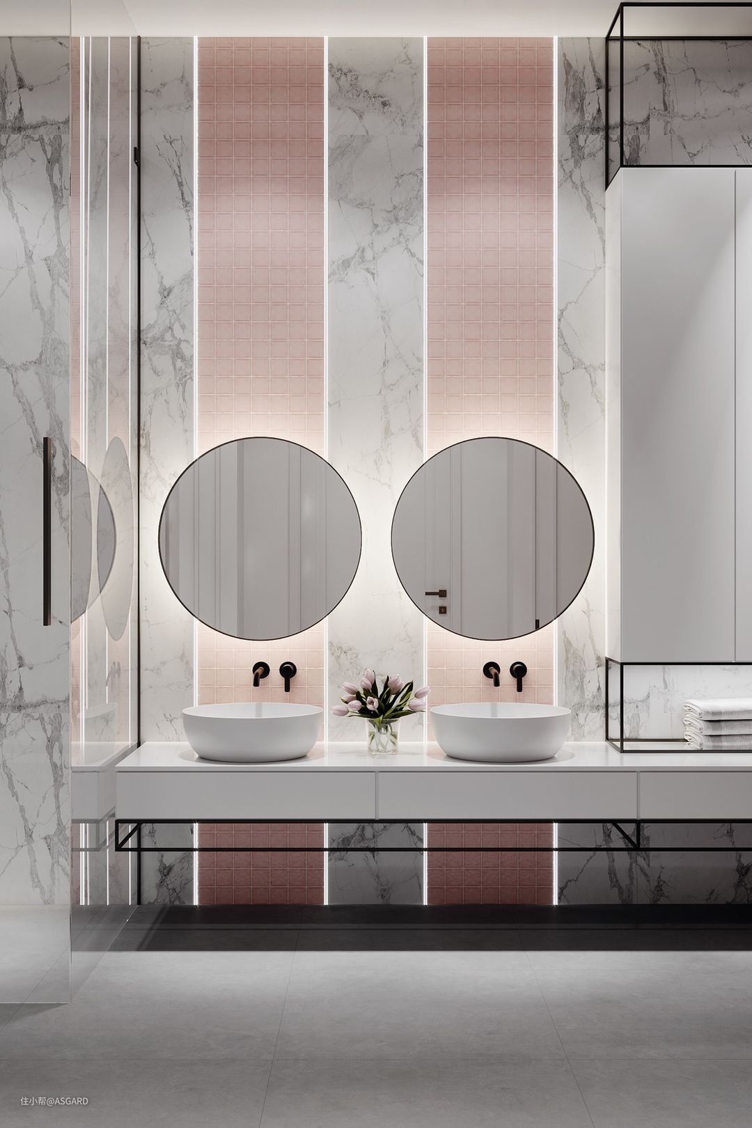 悬挂背光梳妆镜,并用大气LED条形灯强调梳妆效果,使粉红色功能墙成为次要风格。