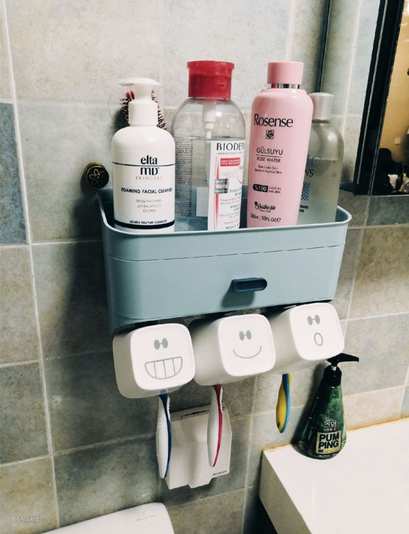中间小抽屉还能收纳发卡头绳,最下面壁挂牙刷杯子,一个置物架基本上就能保证洗脸台干净无物。