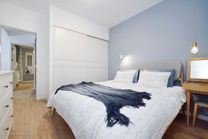 ▲教科书般的家具配色,原木色和白色为主,分别呼应地板和墙面,蓝色点亮空间,表达个性