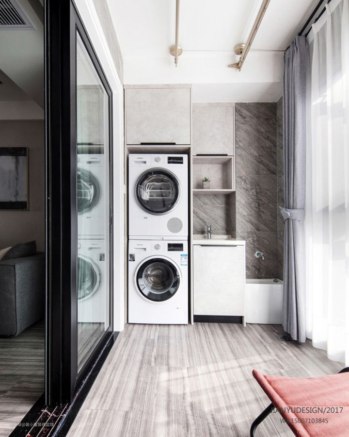还有的设计会为了使用洗衣机不弯腰而抬高整个洗衣机,从而形成落差更大的高低台面。