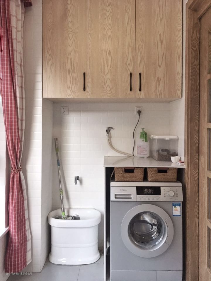 按照阳台、家电的尺寸定制橱柜,可以把洗衣机、烘干机放到柜子里面,整体美观。如果洗衣机高度合适,最简单的做法是加长洗手盆台面,将洗衣机直接放在台面下。