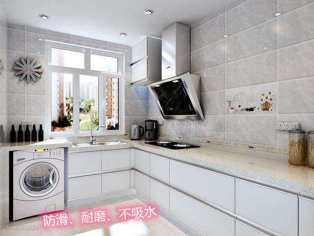 鉴于厨房水多油多的特点,要求我们在瓷砖的选择上考虑防滑、耐磨、不吸水、抗污、易于清洁。选择亚光釉面砖或通体砖都可以。