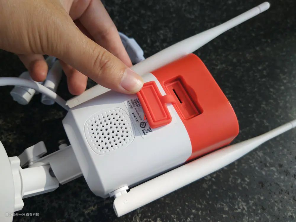 从360智能摄像机红色警戒标准版探头区域来看,与传统商用安防摄像头在功能排布上几乎相同。唯一区别之处在于头部采用色彩鲜明的警示颜色,以及在镜头下方提供了最大128G的视频存储卡位,警报喇叭则位于视频存储卡位下方蜂窝孔区内。