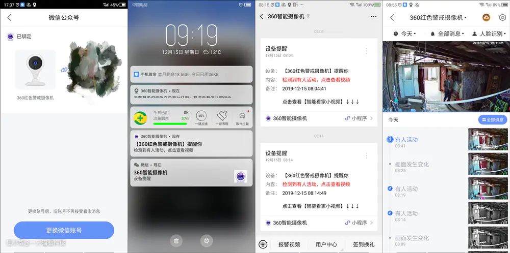 在警报提醒方面,由于用户使用习惯的不同导致360摄像机APP出现被杀进程的情况,这样用户时常不能够第一时间接收到摄像机提醒。为了改变这个尴尬的情况,360增加了微信提醒功能,用户只需在360摄像机APP页面绑定微信公众号并开启微信消息推送即可,这样用户在使用微信时就能够接收到相应的提醒信息,并且可以直接通过微信小程序轻松查看画面,省去了繁琐的切换应用查看的烦恼。