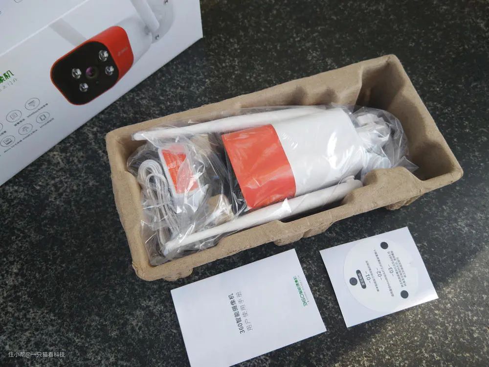 通过将其全部摊开,可以看到一包三对的膨胀螺丝包、用于有线网线防水保护的套件包、红色警戒摄像头主机、电源适配器、说明书、打孔定位贴纸,整体构成非常简单紧凑。