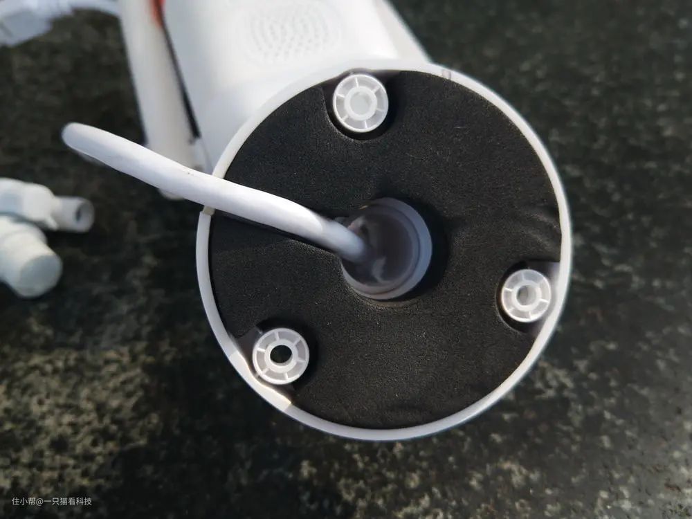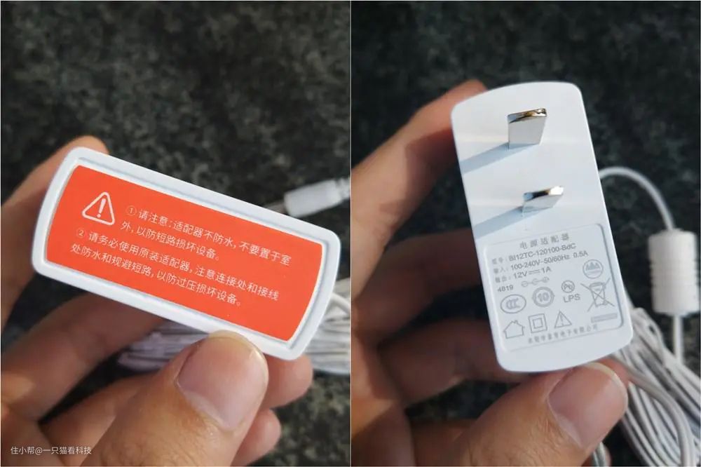 虽然摄像头主机具备防水能力,但电源适配器可做不到这一点,所以为了避免用户错误的将电源暴露在外,特意红醒目的橘红色贴纸在电源背面做了安全警示提醒标语。与家用摄像机不同,为了能够稳定的供给摄像头声、光、摄的使用需求,电源适配器采用了12V≈1A强劲输出功率。