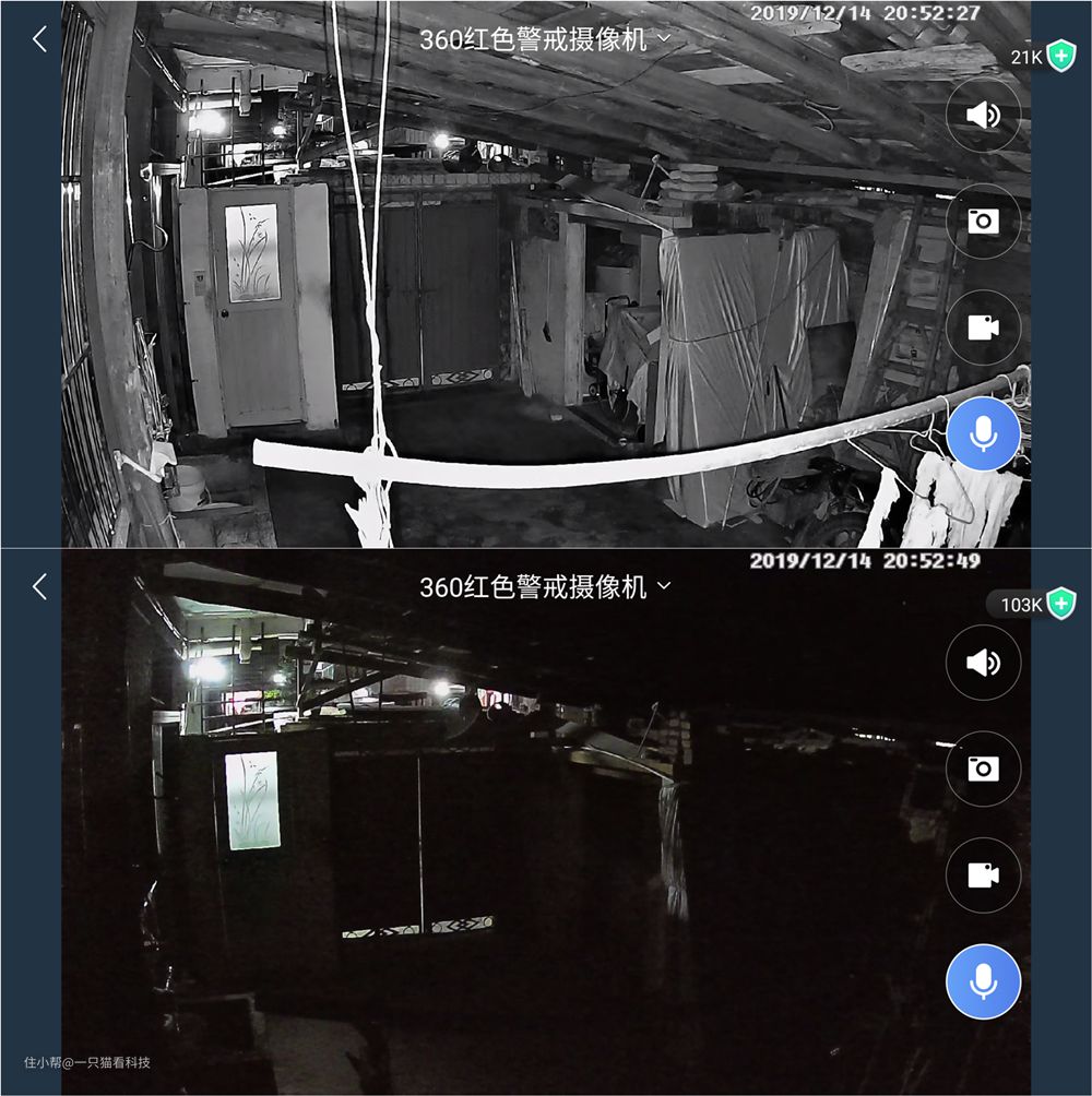 作为智能摄像机,夜间捕捉能力也是必不可少的。对于一般用户而言,系统在设置之初自动通过感光元件识别场景明暗默认开关红外功能。当然,你也可以通过手动开关方式体验一下其视觉效果下的差异。通过两副图片不难看出,850nm的红外线灯光将院子周遭环境照射的非常清晰,而在没有红外线加持的情况下虽然依旧提供1080P的高清画面,但对于镜头内暗处则只能看到黑压压的一片画面。