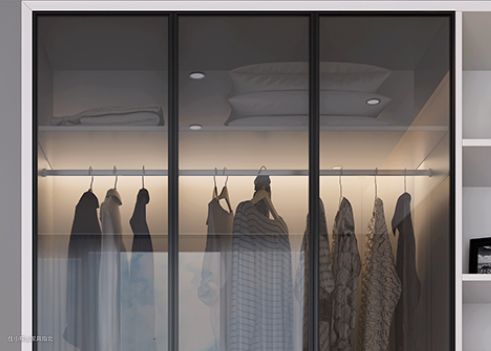 透明玻璃衣橱可以采用黑色门框,使得看似简单的线条更加的灵动,视觉上看起来就像商场中陈列的展览品,好看衣服也成为了空间的装饰品。并且这种玻璃材质具有很强的通透明亮感,在大空间和小空间都非常适用。