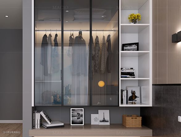 玻璃元素是近几年来比较流行的一种衣柜材质,玻璃元素一般都运用在衣柜门上,它能塑造很多丰富的图样和花纹,让衣柜焕发光彩。而且玻璃材质的柜门更容易清洁和保养,深受现代年轻人的喜欢,现代风格家装特别适合搭配一款玻璃门的衣柜,让整个卧室变得明亮和现代起来,避免了过多使用实木的沉闷感。