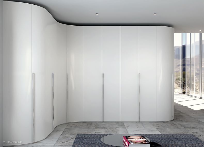 优点:这是一款带弧形转交的平开门衣柜,由正常的衣柜加带弧度的角柜组合而成。设计感极强,衣柜的颜色可以根据卧室的床或是其他的家具进行配色,可以采用木纹或是烤漆处理。优雅而实用,适合存放小件贵重的物品。
