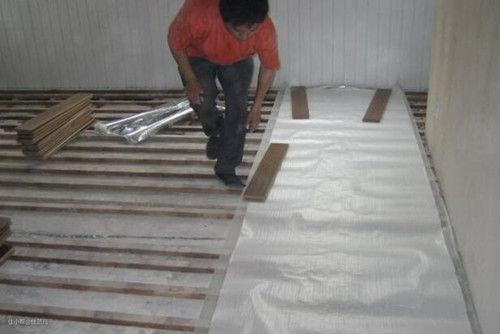 3、为了防止墙体的潮湿影响到木地板,所以铺设防潮垫时,除了把整个木龙骨给覆盖住,还需注意防潮垫沿墙角向上留出10CM左右。另外,木地板与墙体之间也要留有8-12CM的伸缩缝,否则会导致地板膨胀起拱。