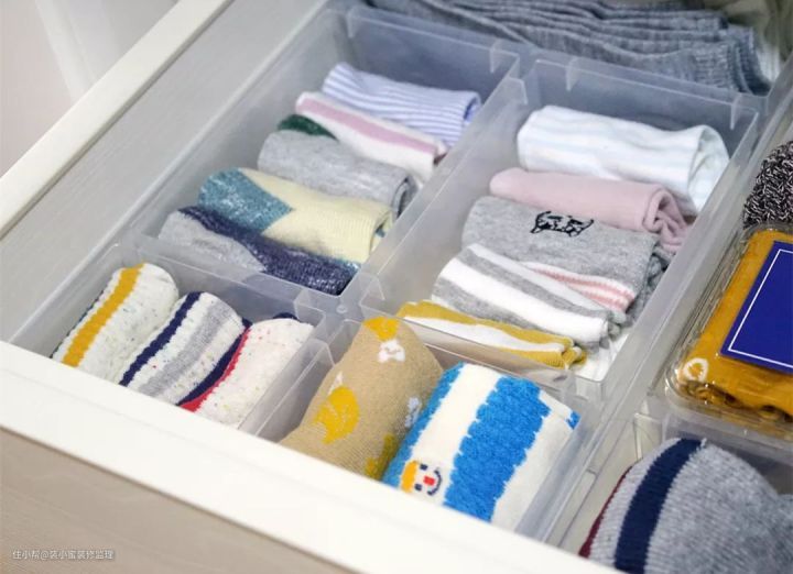 抽屉里的内衣、袜子等小件衣物,采用卷放的方式,依次码好,拉开抽屉一目了然;用抽屉分隔件把内衣、袜子分开,方便拿取,而且卫生。
