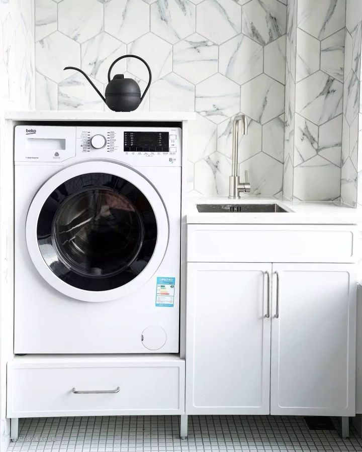 为了使用洗衣机不弯腰,还可以用柜子抬高整个洗衣机,特别适合有老人的家庭,可以更轻松地料理家务。