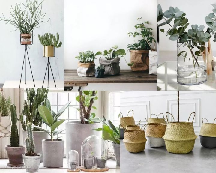 容器的颜值也很重要,除了传统的陶瓷盆和塑料盆,适合现代简约风格的还有金属盆、水泥盆、牛皮纸袋、藤编筐、玻璃瓶等。