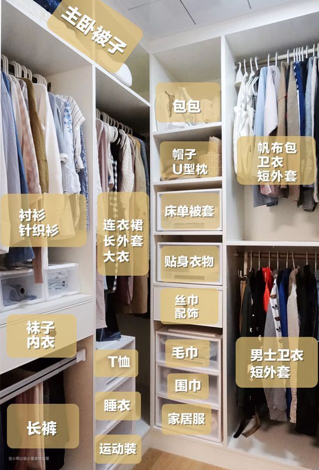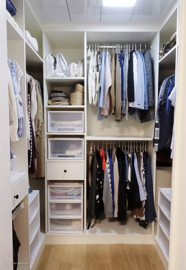 挂衣区一定要多,当季衣物能挂则挂,不会有折痕。挂衣区男女分开,男士的上衣和下装分开,女士的短衣和长裙分开,短衣下方的空间可以做成抽屉,放置包包、围巾、薄T恤、内衣、袜子等。
