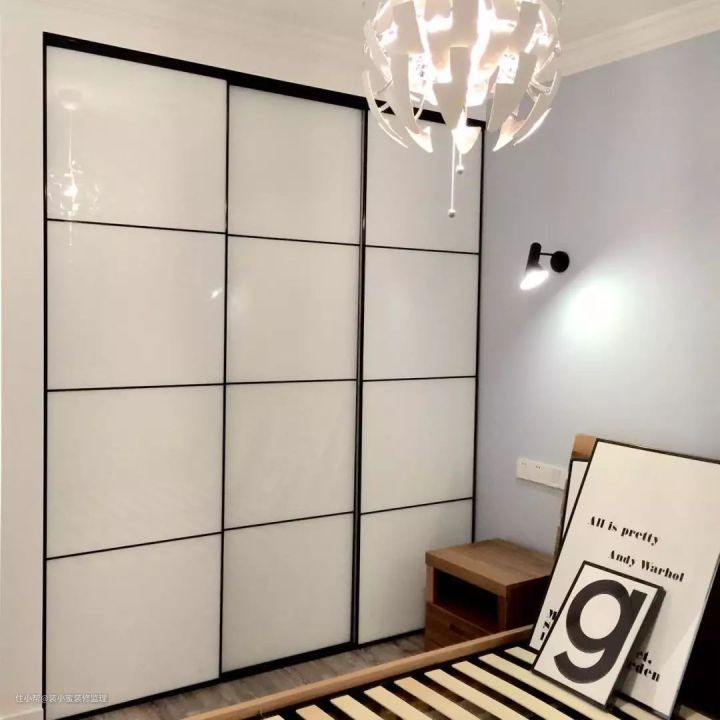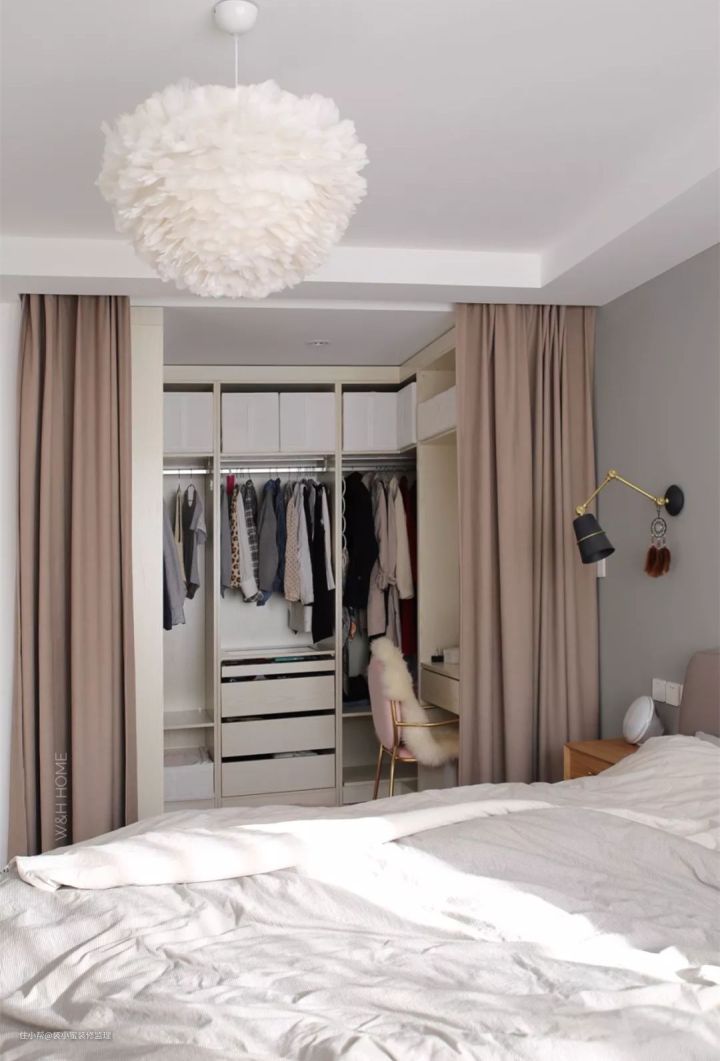衣柜部分,可以通过家具定制实现,设计时,注意衣柜的深度是55cm,三面衣柜中间至少留出90*90cm的腾挪空间,人在里面才不会觉得局促。