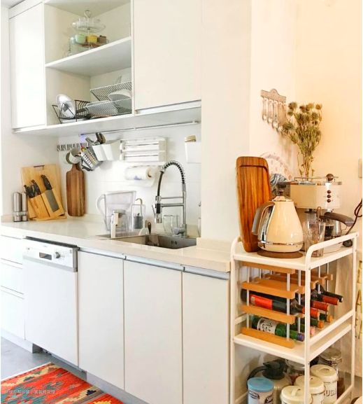 ▲ 依然是屋主Lu的家,小推车紧贴橱柜,方便取用,还能够灵活地在厨房和餐厅之间移动