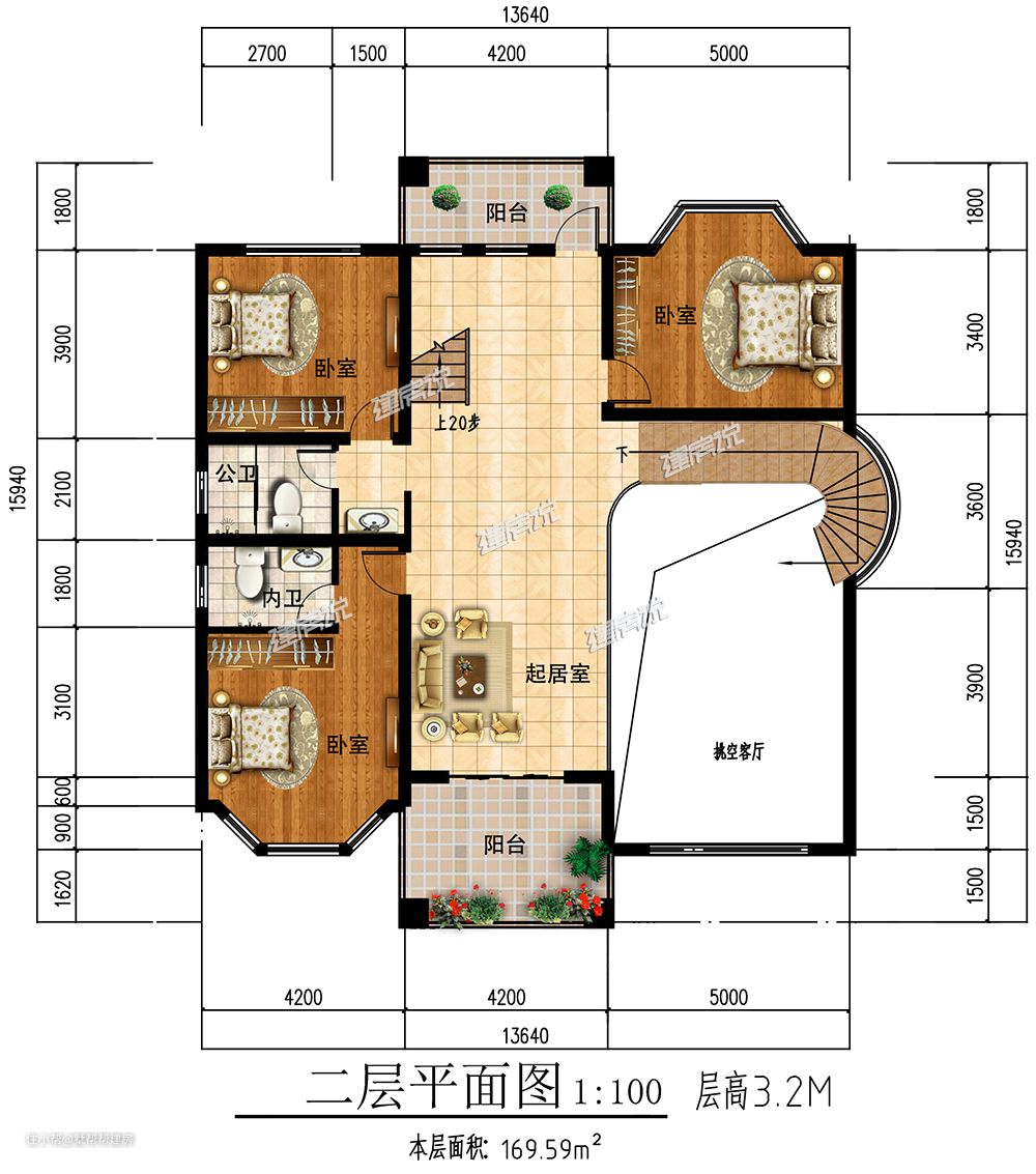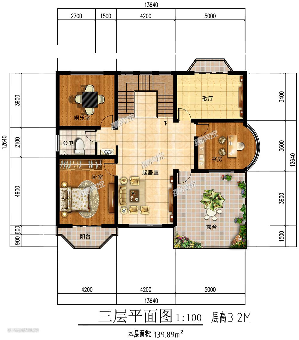 三层:起居室、卧室、书房、娱乐室、歌厅、洗手间、露台