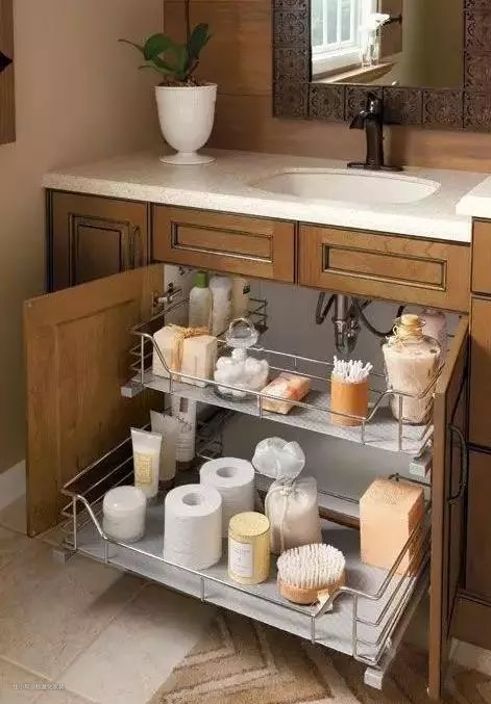 浴室柜下水道部分的空间很杂乱,掺着各式水管在中间,利用伸缩式置物架、滑轨式置物架或收纳箱可以有效的增加空间利用率。