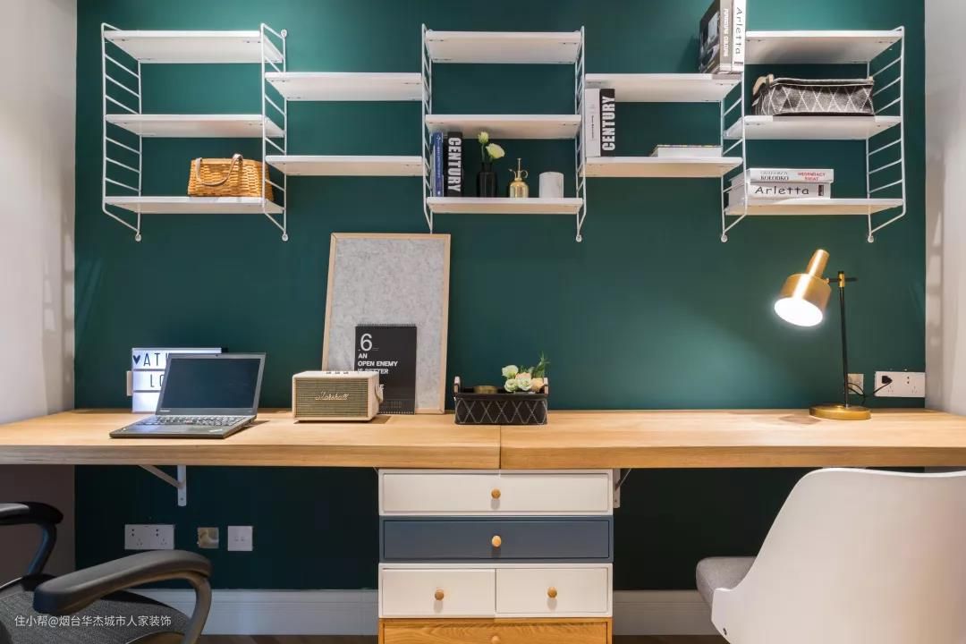书桌其实是一张搁板,中间的调色收纳柜将其分成了两个书桌,墙面上的搁板做成了书架,很有个性。