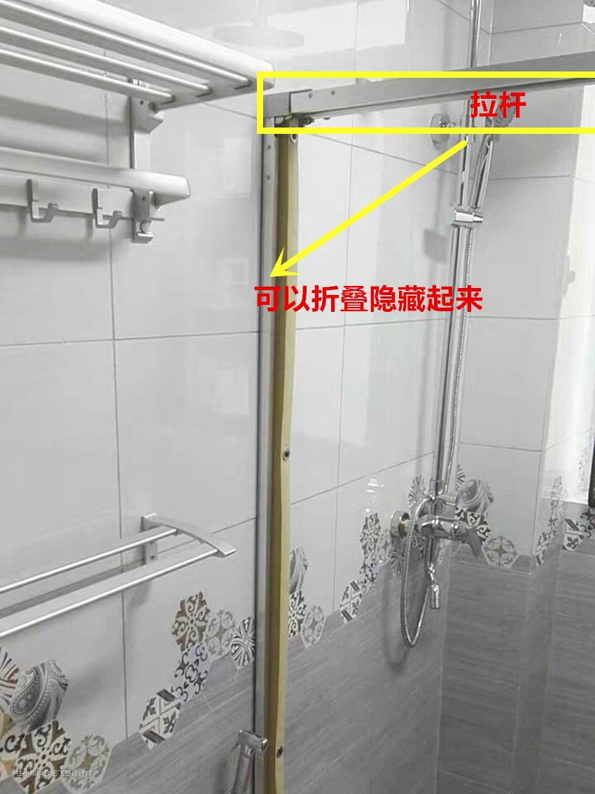 首先从省空间方面来看,当然不是和普通浴帘一样简简单单往旁边一拉就搞定啦,这种隐形浴帘是可以折叠的,洗澡时将拉杆拉直,然后浴帘滑动就可以顺畅自如,不洗澡时可以直接将拉杆和浴帘一起收回,外面有个盖子,隐藏效果简直不要太好,不占卫生间1㎡,不得不说,真的是小卫生间设计的首选啊!