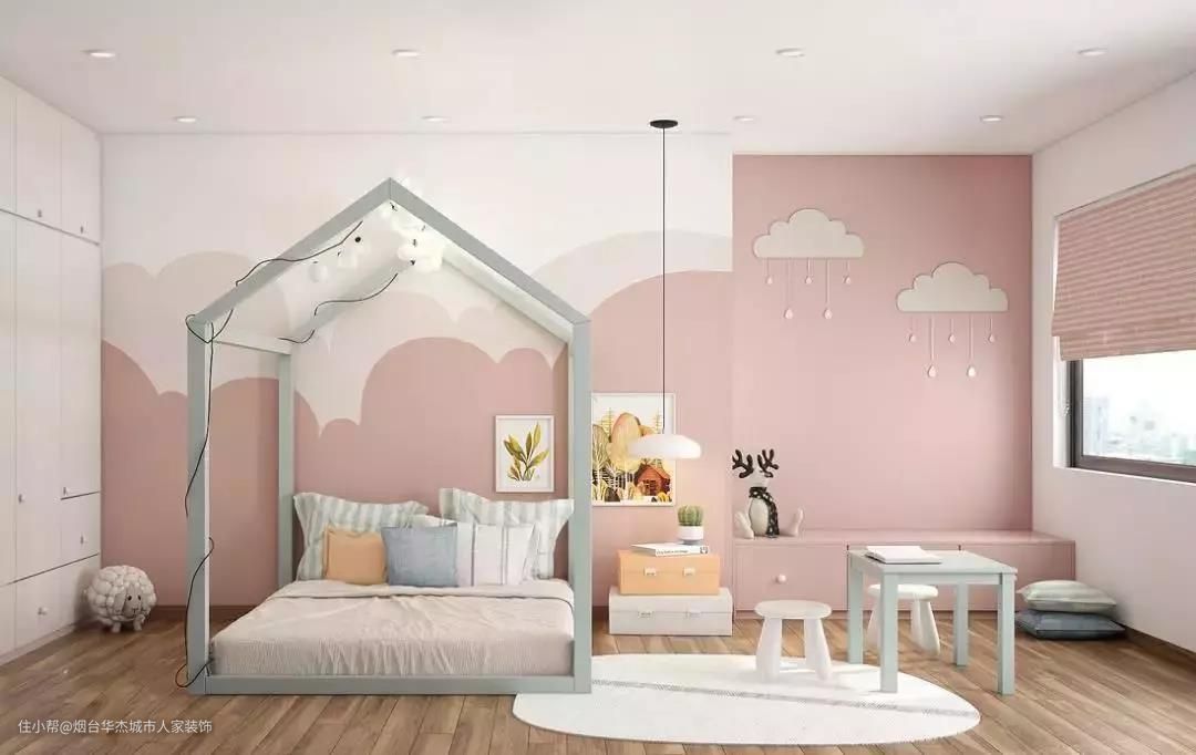 女孩房比较适合选择甜美暖色调尤其是甜甜的粉色系,光与影营造温馨的氛围。
