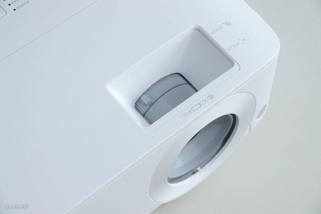 接下来我们先来看下这款明基E520投影的外观设计吧,机身为全白色,明基家的投影几乎都是全白设计。看上去显得很简约,正面的大眼睛镜头格外显眼,也成为明基投影的标志性设计,看到它就知道出自谁家了。它的镜头采用内凹式设计,对镜头的保护起到一定的作用。