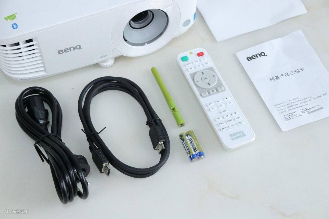 最后再来看下配件方面都有哪些呢?一起来看下吧。投影主机E520是必须要有的吗,除它之外,还为用户准备了一条电源线,一条HDMI高清线,一个白色的遥控器,一根WiFi绿色天线,还有两节7号电池。再就是相关的说明书,质保卡之类的了。
