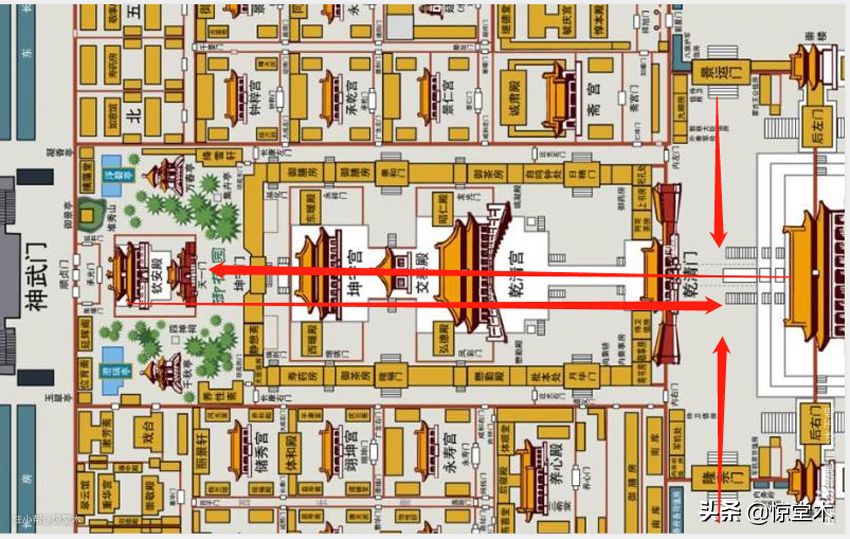 对于每一个空间而言都会有一个中心点,从室外的城市规划,到庭院居室设计,这个中心点都非常容易找到,规则空间内对角线或十字线的交叉点就是中心点,贯穿这个中心点或横向或纵向的延长线,其中一条(也可以是两条)就叫中轴线。这条中轴线的两侧大多是对称的,当然也可以是不对称的。比如北京城以紫禁城为基点,南北方向的延伸线就是中轴线,从正阳门箭楼,到天安门城楼,贯穿皇宫内部到神武门,再到景山公园,钟鼓楼...大环境下的中轴线概念和室内中轴线的道理是相通的。