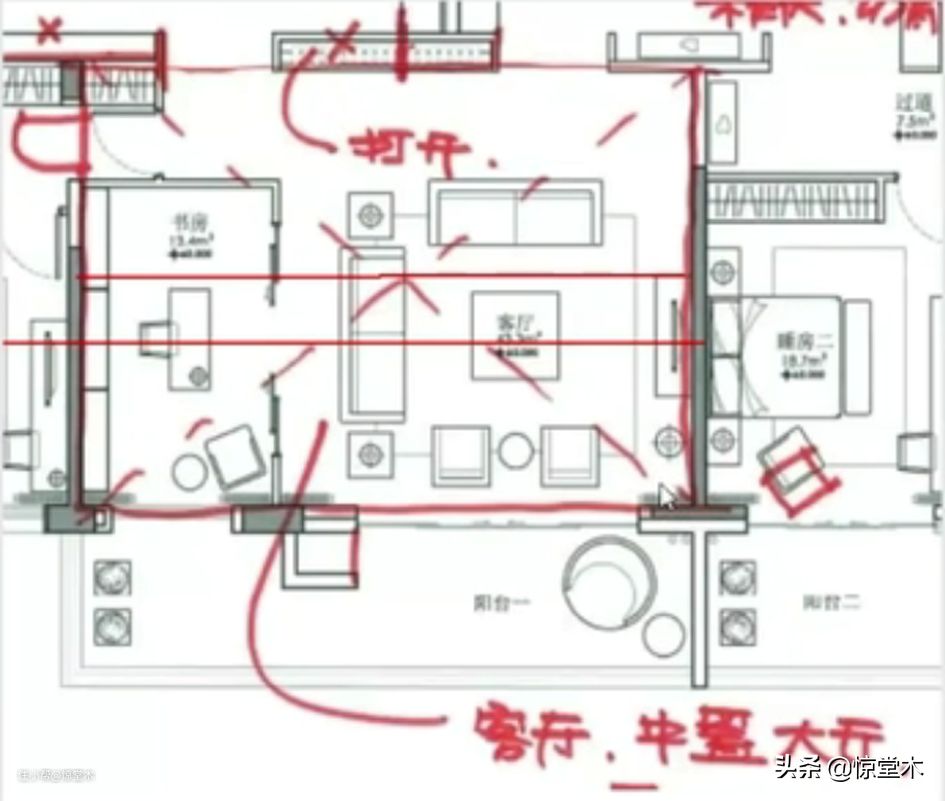 我们再来看一个我们容易判断错误的案例。我们经常会忽略走道的尺寸,所以说把这个中轴线就给下移了,其实中轴线应该在整个空间的中间,可能会有人说不太好判断,其实设计就是为了要解决这个问题。