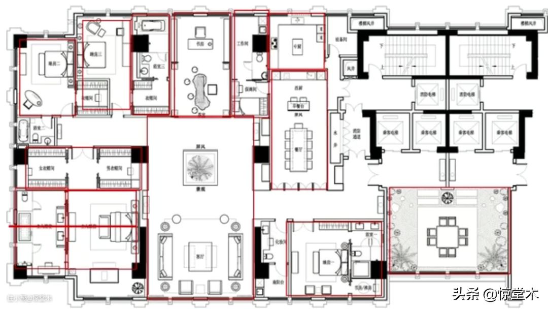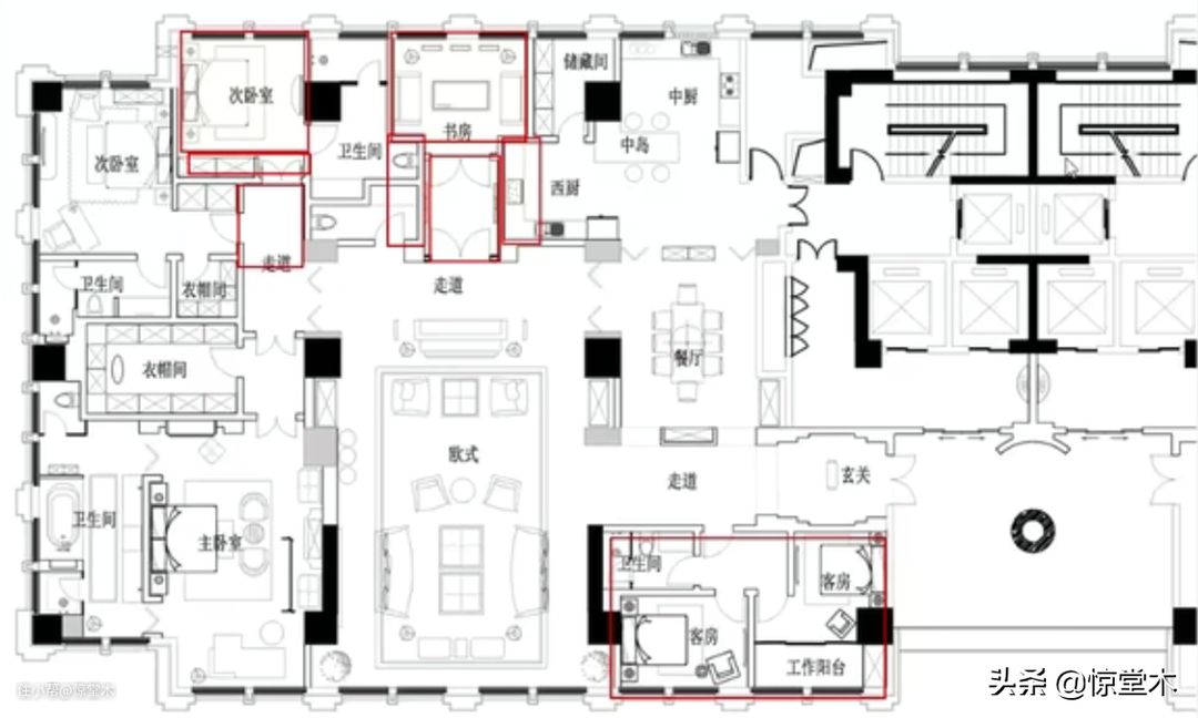 第一个是按照“中轴线”理念设计方案:我们会感觉是一个比较充实的空间,景观、客厅、餐厅、西厨、中厨,主人睡房,主人浴室,衣帽间,包括这个户外的景观,其他房间就不用多说了,都是规规矩矩的,书房是整个敞开式的,南北通透的,每个空间都是一个很规则的一个长方形。