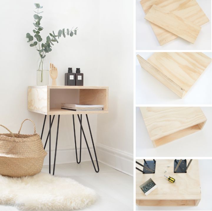 以这个床边桌距离,上下、左右各两块板,可以钉也可以粘,然后再用螺丝把另买的支腿安上就行了。
