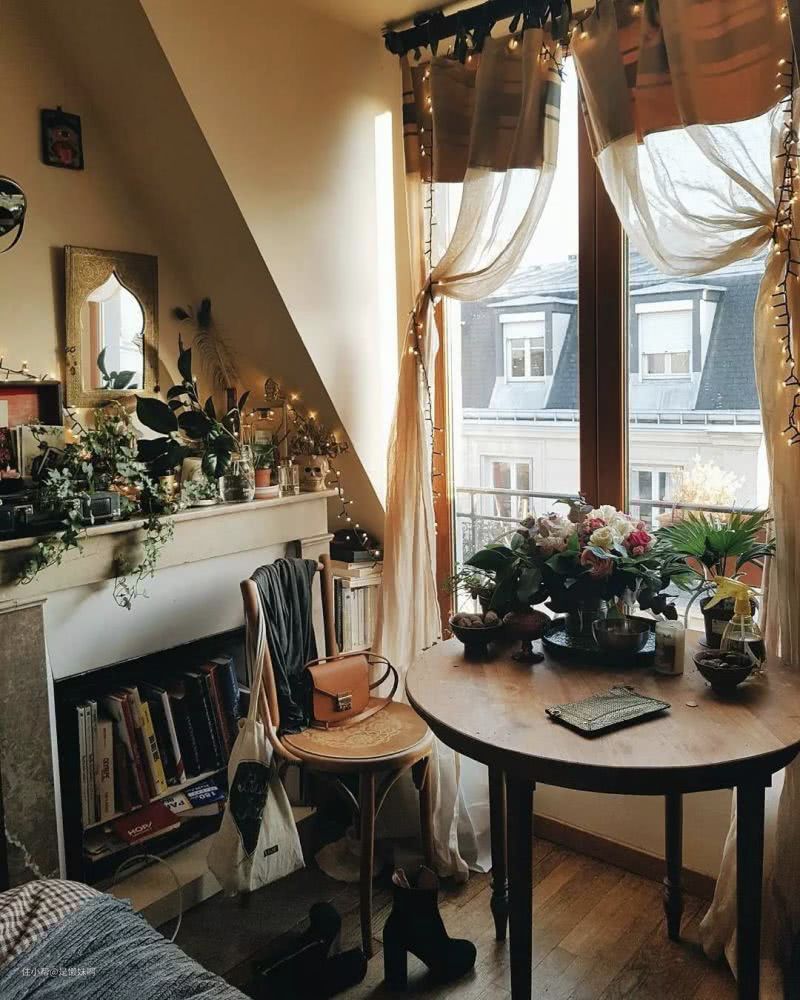 不同于我们喜欢强迫症似的,把书整整齐齐的摆在书架里,油画挂在床头的墙上。
