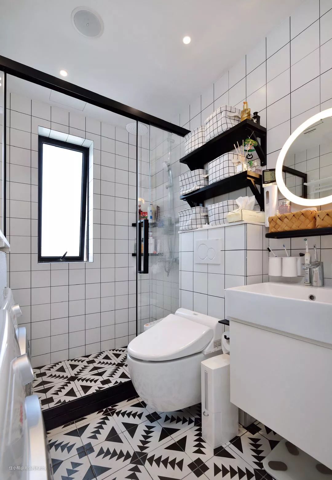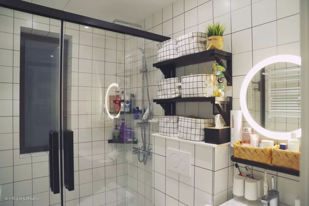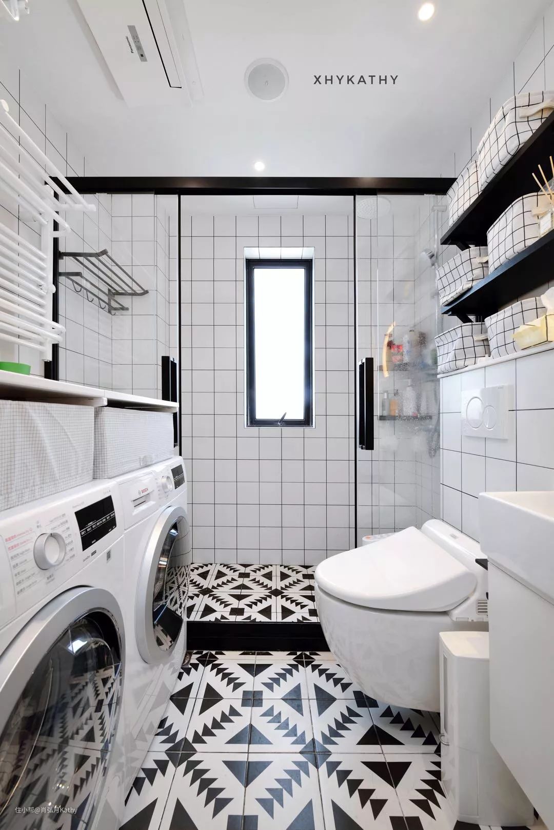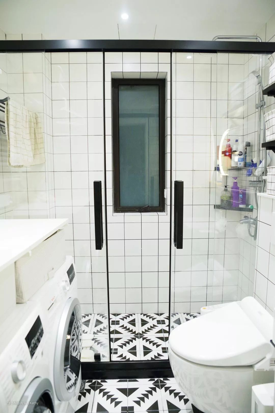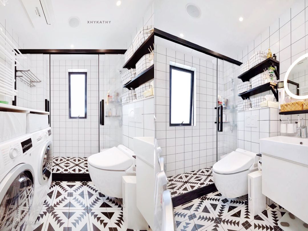 整体色调和风格依旧是黑白简约,地砖及墙砖和厨房保持一致,风格统一的同时又节省物料;