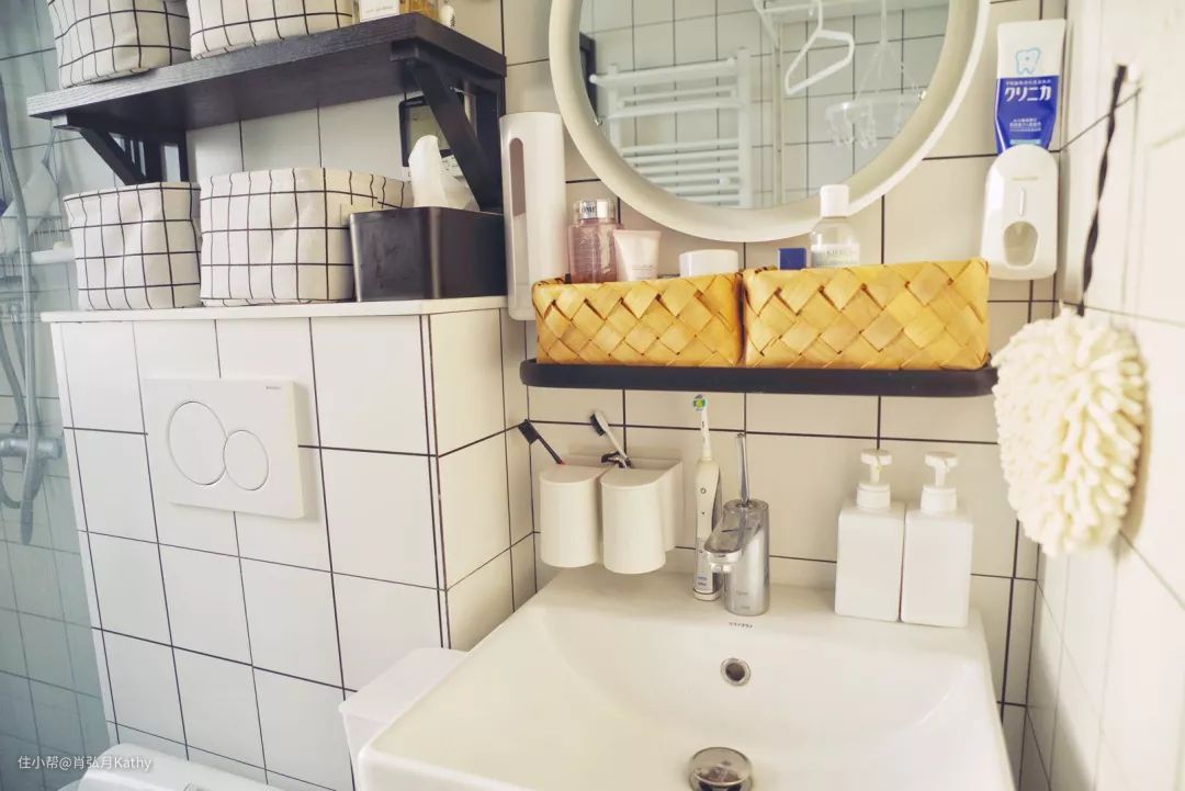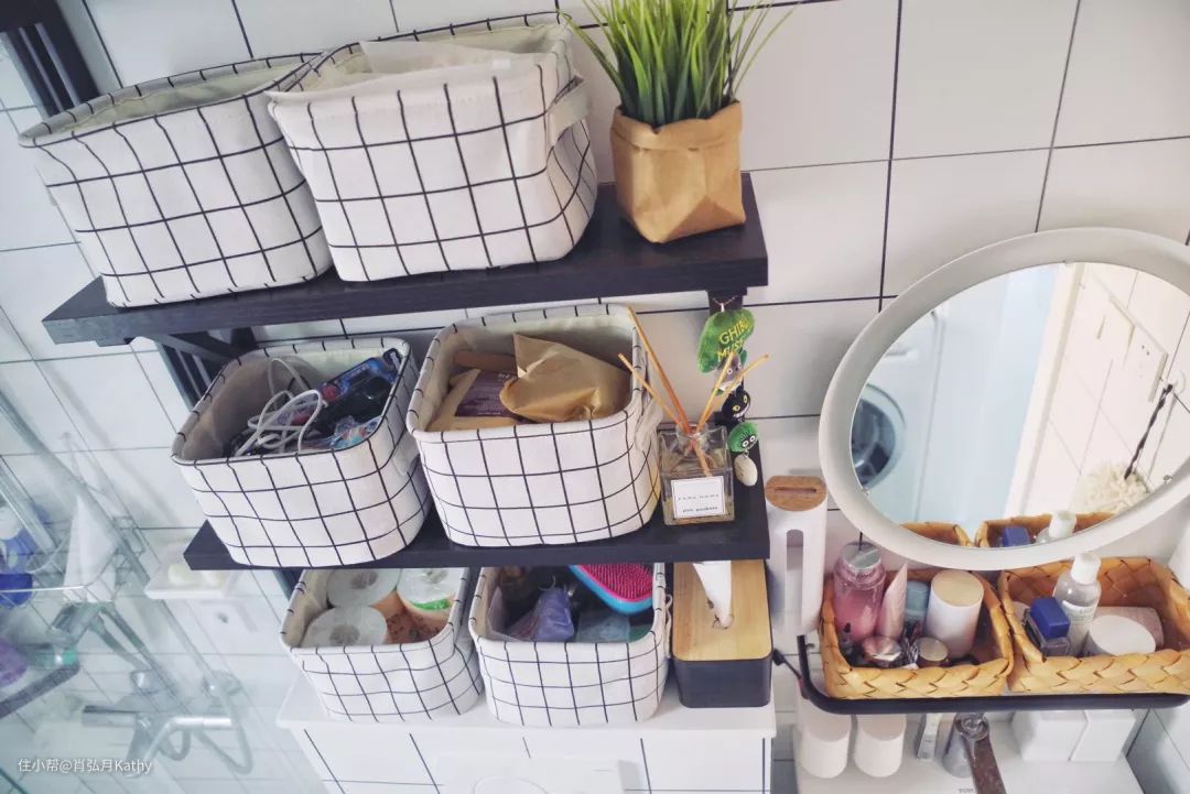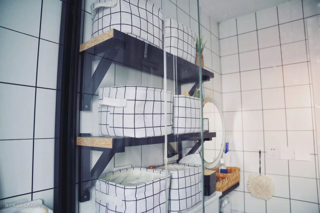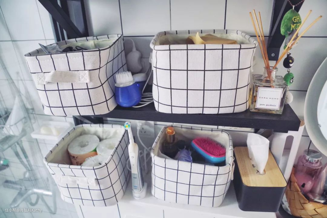 六个收纳篮是防水牛津布材质,耐潮又能装,黑白格和墙砖统一;