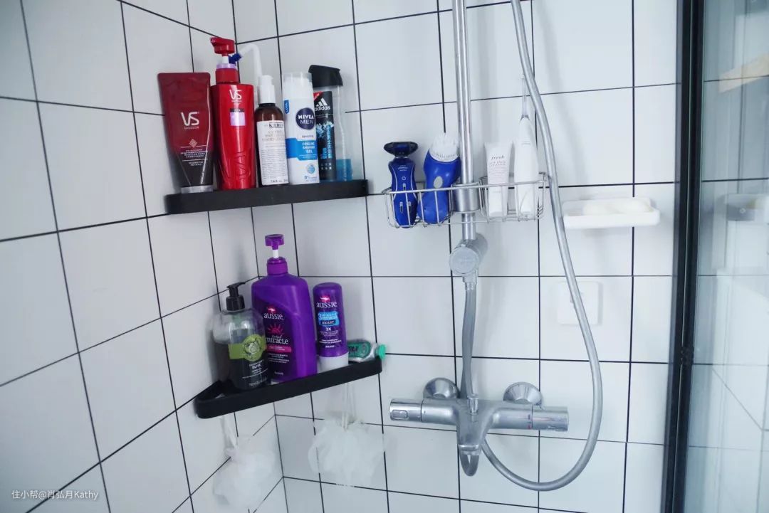 拐角墙面搁架和镜灯下方的搁架是一家,买了两只挂墙,中间留足空间,分别放置两个人的洗浴用品,下方分挂两只沐浴球;