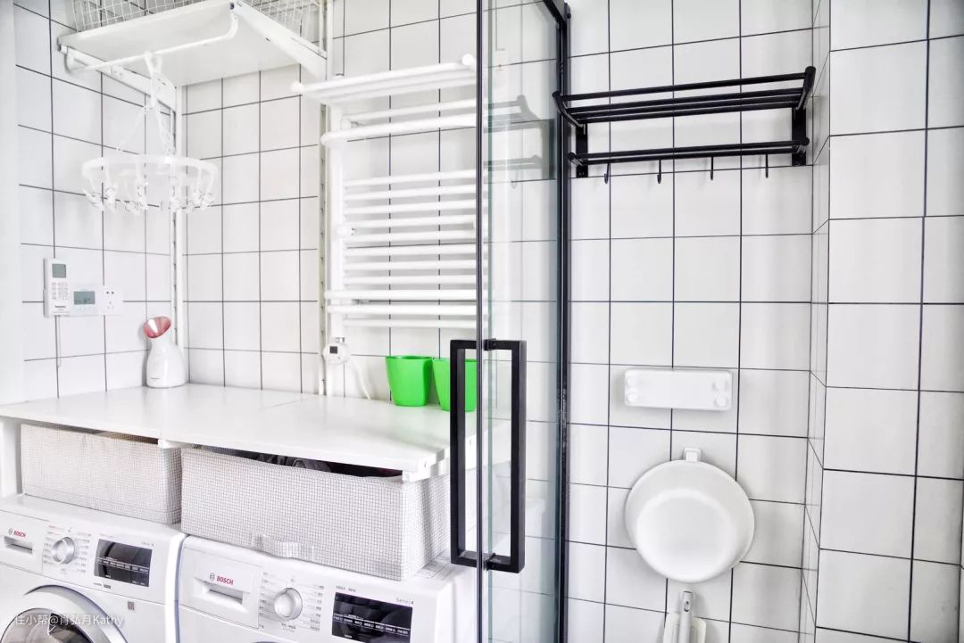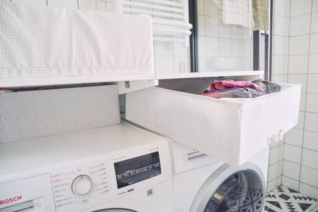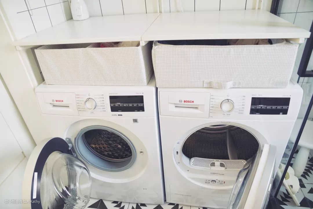 洗衣机洗好了衣服直接丢右边的烘衣机,衣服烘好了可以在上方的台面进行折叠,动线超流畅。