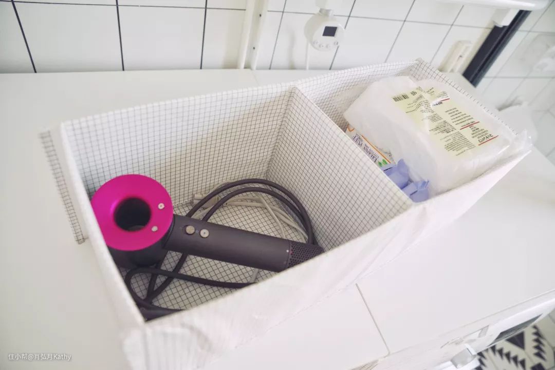 左边靠近门口是两个双格篮筐,放置吹风机和各种卫生用品替换装;